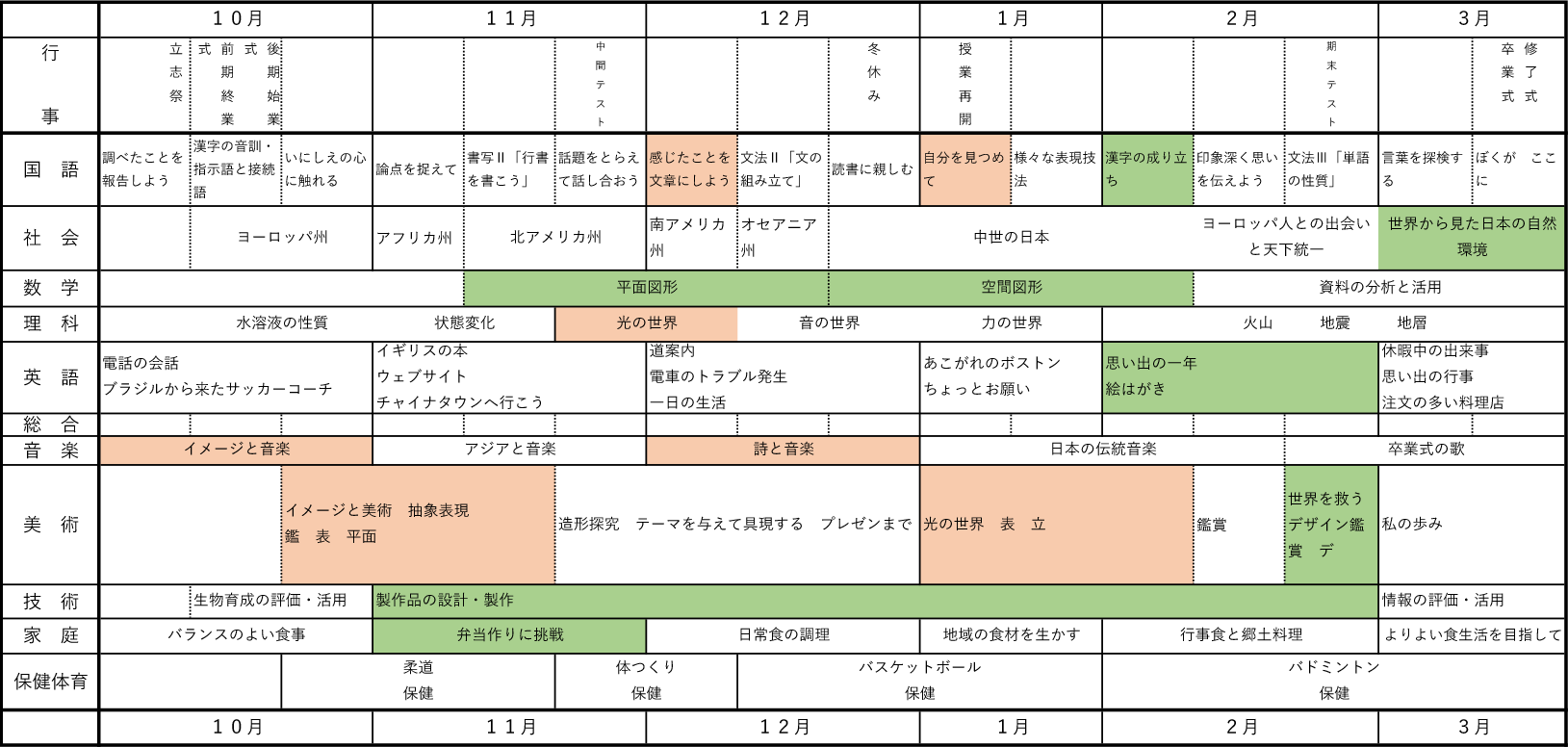 実施予定の題材に関連する他教科の単元に色をつけています。美術はただでさえ授業時数が少ないため、限られた時間で学びを深めるために、導入や発想の段階で他教科と関連させて考えてもらうということを私は以前から行っていました。