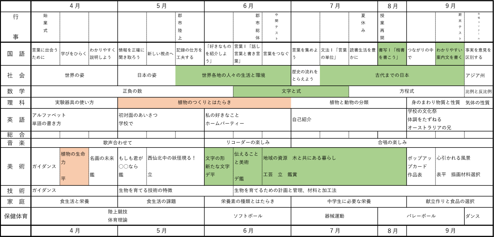 下の図は筆者の学校の年間指導計画(1年生)です。